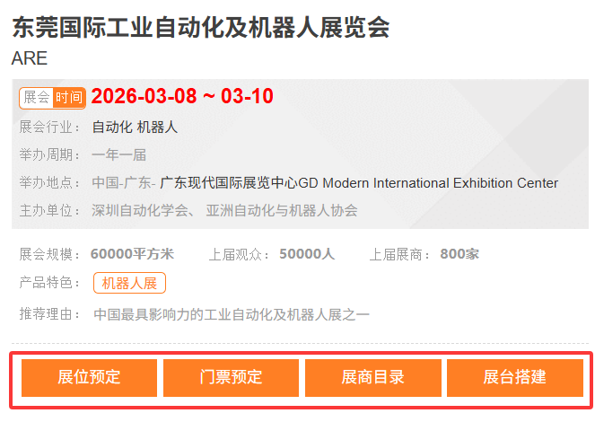 东莞国际工业自动化及机器人展览会ARE【展位预定、门票预定、展商目录、展台搭建、差旅行程、签证、翻译、物流运输、补贴申报】