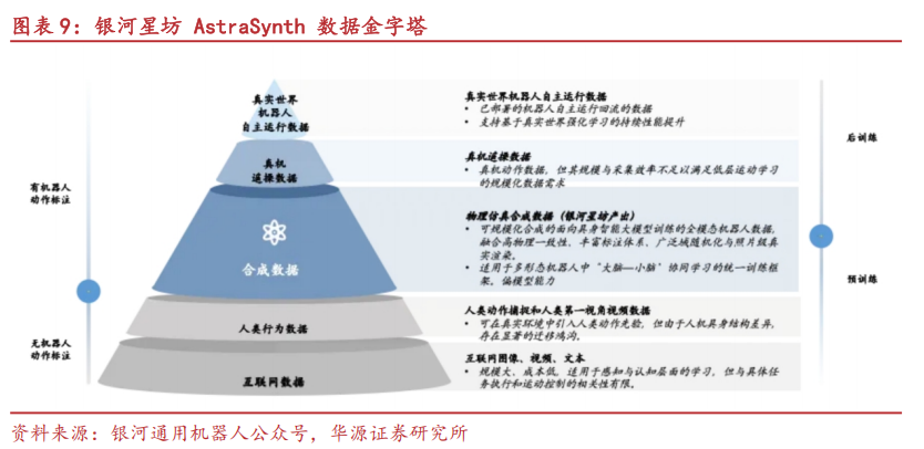 虚实数据训练:模型以合成仿真数据为主、真机数据为辅,构建了百亿级具身智能数据集,以银河通用技术体系中虚实融合的数据基建—— “银河星坊”(AstraSynth)为基石,通过以下四步完成训练:①人类少样本示范,②仿真数据合成,③强化学习闭环,④真实世界再“见习”。