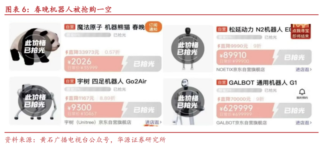 据科创板日报,马年春晚开播两小时(2 月 16 日 20:00-22:00),京东机器人搜索量环比增长超 300%,客服问询量增长 460%,订单量增长 150%。新增订单覆盖全国 100 多座城市,从一线城市到大小县域均有分布。在除夕当晚 10 点,京东也上架了包括“春晚同款”机器人在内的多款机器人。在活动上线几分钟内,包括魔法原子、宇树科技、松延动力等品牌的机器人即被抢购一空,其中价值近 63 万元的 GALBOT 通用机器人 G1 同样被抢购。同时,宇树科技创始人王兴兴在接受财联社记者采访时表示,2026 年宇树科技的目标出货量在 1-2万台左右,相对于 2025 年超 5500 台出货呈倍数级增长。