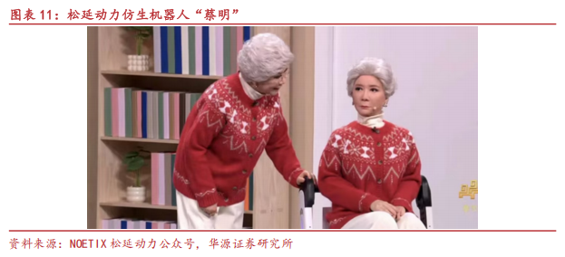松延动力在小品《奶奶的最爱》里带来了三款共四台人形机器人:万元以内、身高仅 94厘米的 Bumi,身高 1.2 米的运动型人形机器人 N2,身高 1.36 米的通用人形机器人 E1。在节目中展现了讲笑话的交互能力以及拟人摆臂跑步、后空翻、侧手翻的运动能力,节目后半部分仿生人形机器人“蔡明”,能够通过口型、表情、眼神、颈部姿态及手势来呈现人的灵动感,毛孔细节、皮肤质感非常逼近真人。