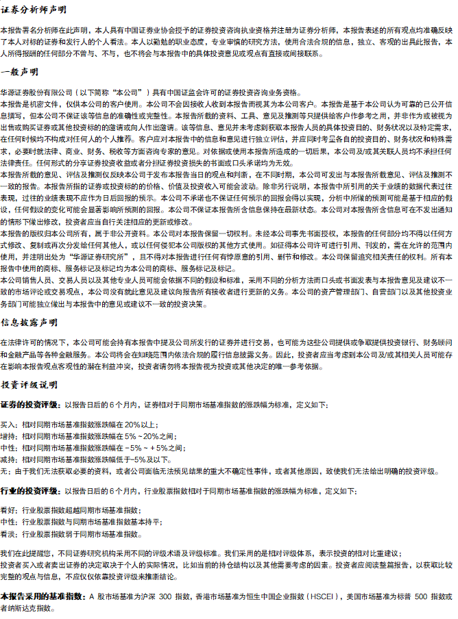 本公众号不是华源证券股份有限公司(下称“华源证券”)研究报告的发布平台。本公众号只是转发华源证券已发布研究报告的部分观点,订阅者若使用本公众号所载资料,有可能会因缺乏对完整报告的了解或缺乏相关的解读而对资料中的关键假设、评级、目标价等内容产生理解上的歧义。订阅者如使用本资料,须寻求专业投资顾问的指导及解读。