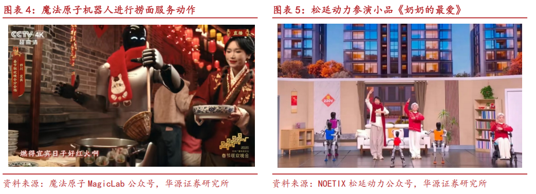 机器人出圈马年春晚,从表演到干活样样通。①宇树科技表演了后空翻、双截棍等高难度武术并“踏云飞行”;②银河通用展示了盘核桃、叠衣服等智能自主的精细微操;③魔法原子完成了伴舞及“起面到送餐”的服务闭环;④松延动力参演小品展示互动能力,并以仿生机器人呈现了高度逼真的拟人状态。