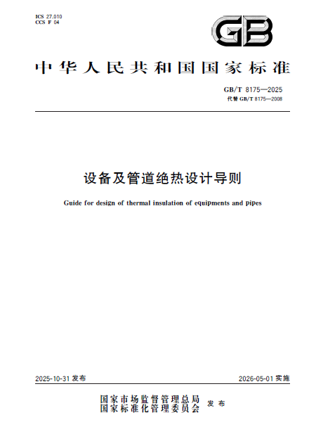 GB/T8175-2025设备及管道绝热设计导则》标准已经发布了,代替GB/T8175-2008,发布日期2025年10月31日,实施日期2026年5月1日。