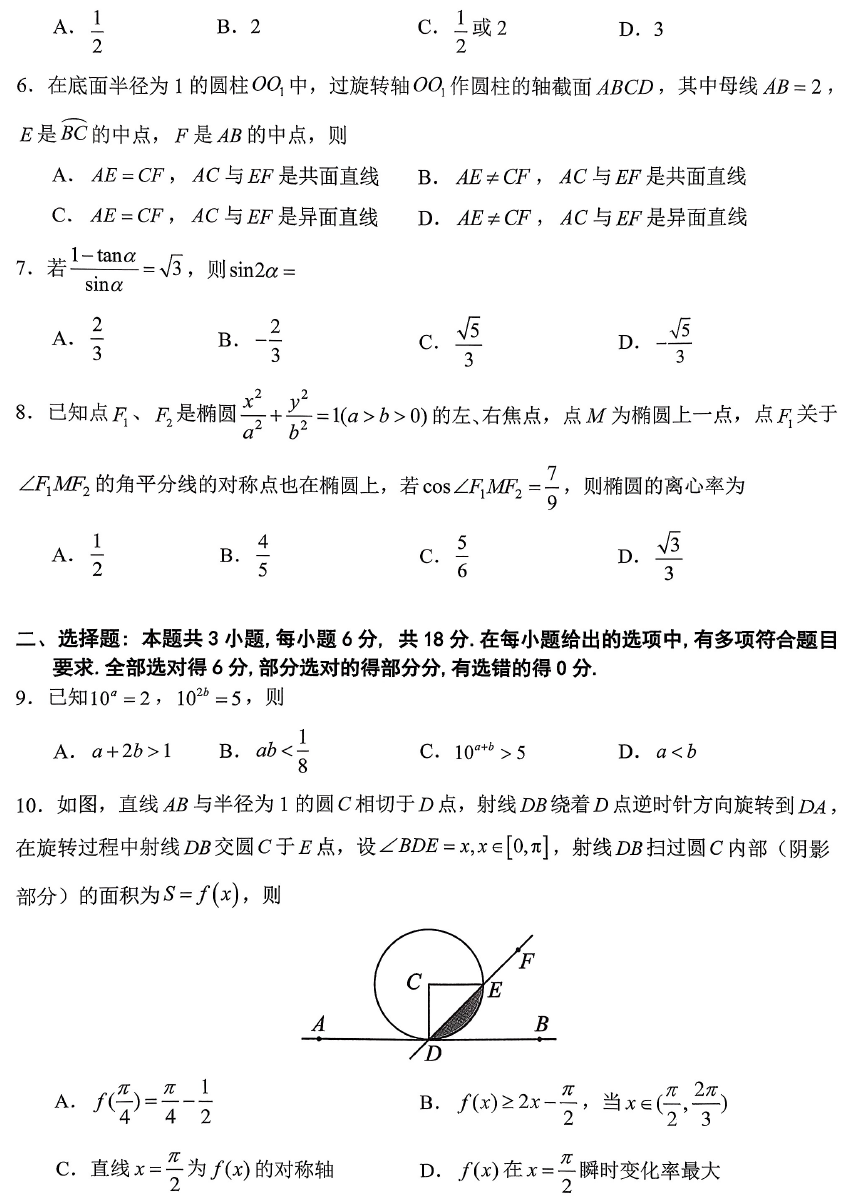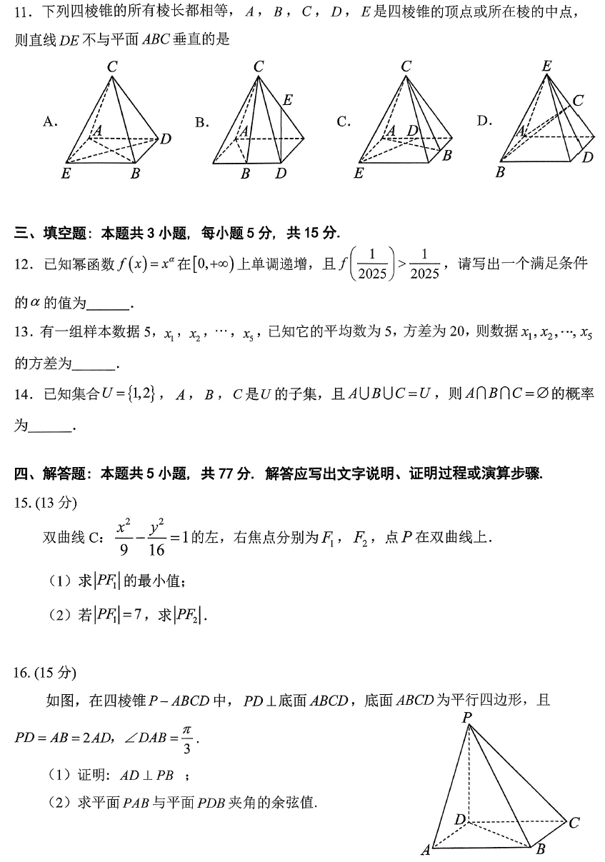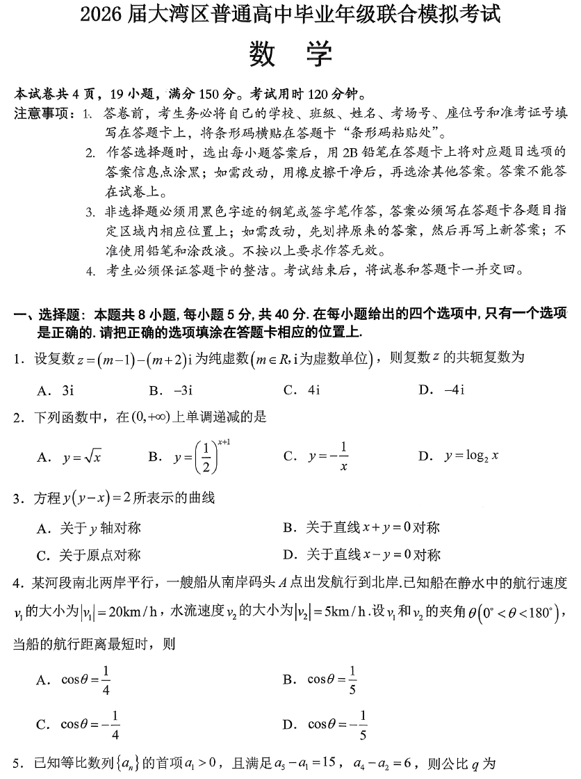 广东省大湾区2026届高三上10月联考数学试题与参考答案