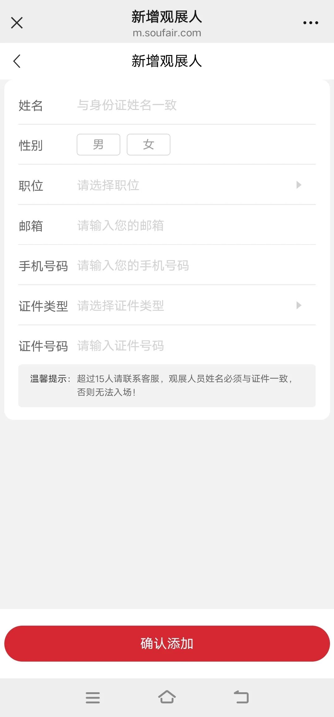 点击新增观展人,填写实名信息并提交,请注意信息确认准确填写,否则会影响出票。