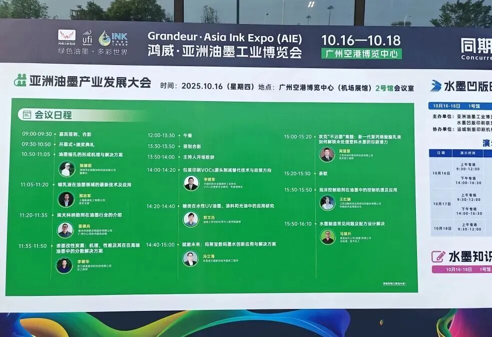 2025 年 10 月 16 日(星期四),亚洲油墨产业发展大会在广州空港博览中心(机场展馆)2 号馆会议室成功举办,汇聚了亚洲地区的知名油墨企业与行业专家。江西五色石新材料有限公司受邀参会,作为专业油墨助剂生产商,在大会上重点展示了核心产品 —— 润湿剂、消泡剂、流平剂,这些产品可广泛应用于 UV 光油、数码喷墨、丝印油墨、凹版油墨等主流油墨及相关产品生产环节,能针对性解决不同油墨体系的润湿分散、消泡抑泡、流平平整等关键技术问题。现场,公司还与业界同仁就产品应用场景拓展、油墨产业技术升级等话题展开深度交流,为助力亚洲油墨产业高质量发展注入助力。