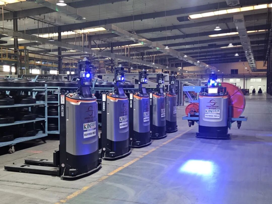 车间里,近40台AGV自动运输小车通过5G网络实时通信,搭载先进的激光导航技术,以±10毫米的定位精度灵活穿梭。它们能自动避让行人与临时设备,从立体线边库到成型机台的物料运送全程由MES系统智能调度,无需人工干预,其智能控制技术达到了国际先进水平,实现生产管理数字化、物流自动化。