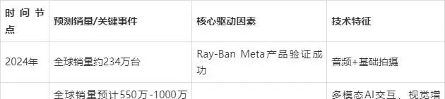 市场爆发: 2024年全球AI智能眼镜销量约234万台,主要得益于Ray-Ban Meta的成功。预计2025年销量将翻倍至550万台以上,甚至有乐观预测认为2026年智能眼镜总出货量将超过1000万台。