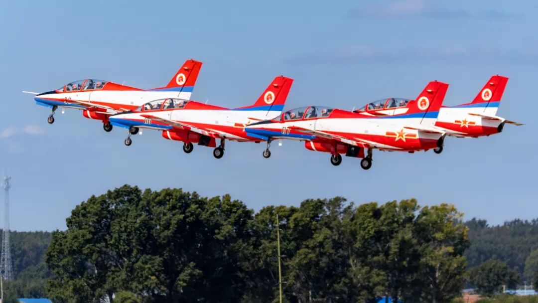 这是空军航空大学“红鹰”飞行表演队带来的动作——“双机点赞”。此前,他们曾在第十五届中国航展上首次表演这个动作。