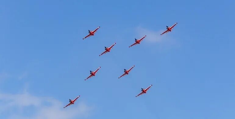 “红鹰”飞行表演队队员均由空军航空大学飞行教官兼任。八机钻石斤斗、七机开花、龙腾盛世、四机对冲、六机快滚……为了这次活动,飞行教官们共准备了19个难度大、样式新的表演动作。比如,在表演八机钻石斤斗——这一“红鹰”飞行表演队的招牌动作时,两架飞机之间的间隔只有3米。