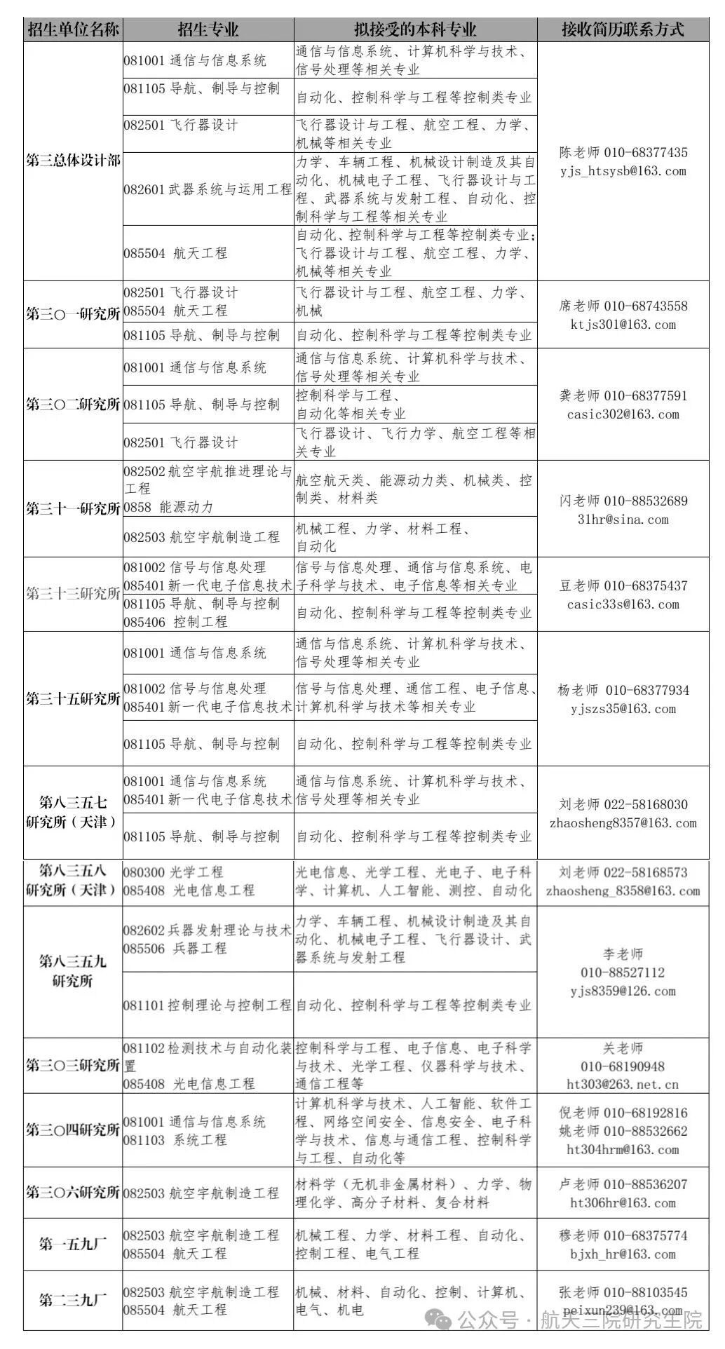 2026年4月7日前,申请人可将个人简历发送至航天三院招生邮箱:yjsht03@163.com,也可以直接发送邮件至各招生单位,并电话联系。邮件标题命名方式:姓名+初试总分+本科就读院校+调剂专业。