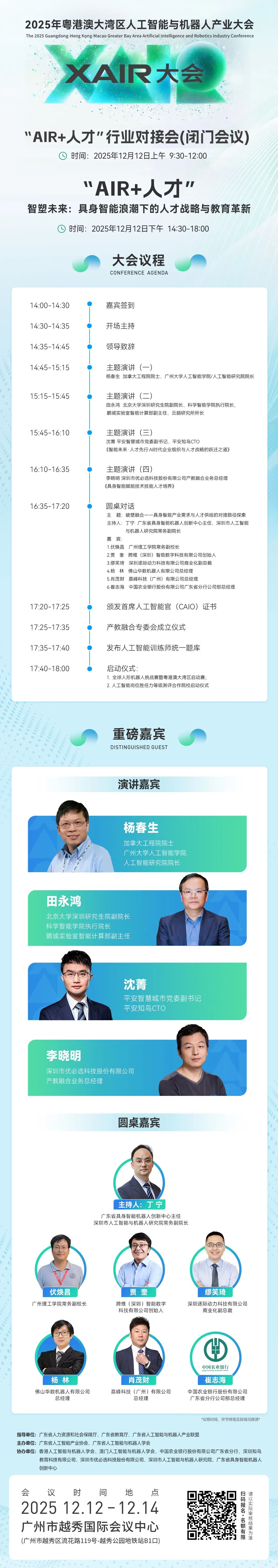 2025年粤港澳大湾区人工智能与机器人产业大会“AIR+人才”论坛,将于2025年12月12日在广州隆重召开。本次论坛由广东省人工智能与机器人产业联盟指导,广东省人工智能产业协会、广东省人工智能与机器人学会主办,香港人工智能与机器人学会、澳门人工智能与机器人学会、中国农业银行股份有限公司广东省分行、深圳知鸟教育科技有限公司、深圳市优必选科技股份有限公司、深圳市人工智能与机器人研究院、广东省具身智能机器人创新中心协办。