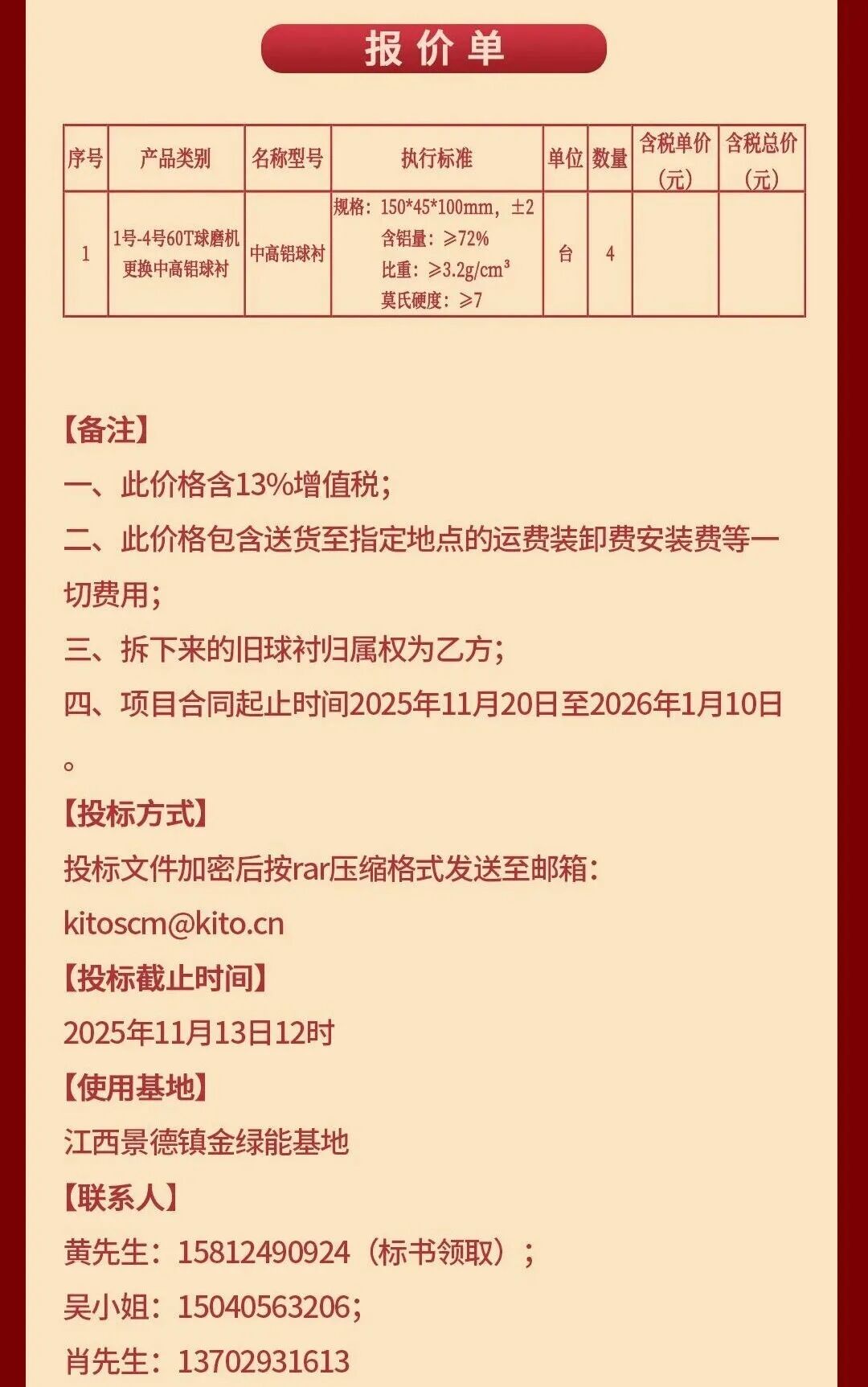 4、金意陶集团金绿能60吨球磨机球衬更换采购项目招标