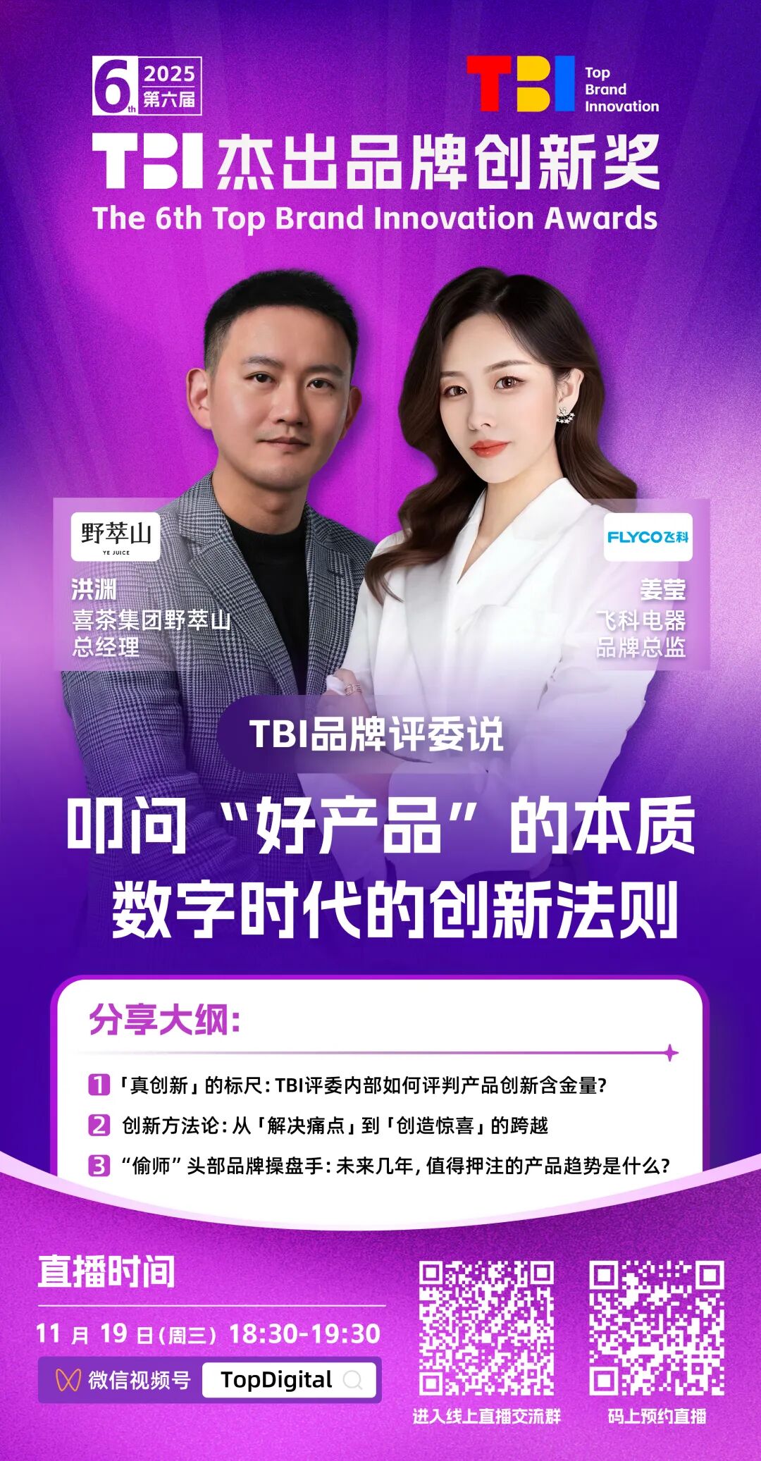 如何定义“好产品”,让创新摆脱自说自话,赢得用户与市场?两位TBI评委——来自华住集团飞科电器的品牌掌舵人,分享评判“好产品”与“真创新”的标准。让产品从“解决痛点”到“创造惊喜”,有迹可循。扫码预约直播,11月19日(周三)18:30-19:30,一起解码产品创新!