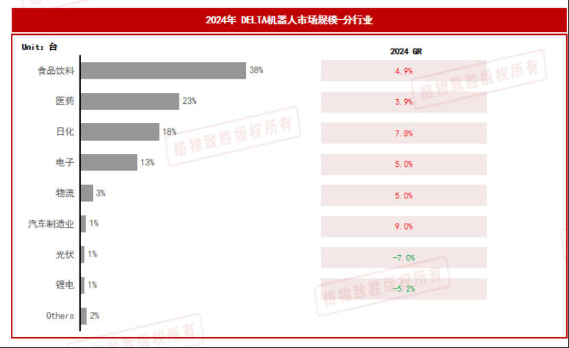 DELTA机器人销量增长主要源于新能源汽车、光伏等新兴行业持续稳定的需求增长,以及传统食品饮料以及包装等行业带来部分需求增长。