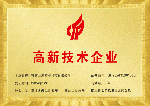 从资质认证到荣誉加身,台源塑胶的每一步都走得坚实有力。公司已获得ISO9001质量管理体系认证、ISO14001环境质量管理体系认证、ISO45001职业健康管理体系认证、计量保证体系认证、环境标志产品认证、节水产品认证、绿色建材认证等多项权威资质,更斩获2024年度国家高新技术企业、2025年福建省创新型中小企业、2026年福建省专精特新中小企业等多项荣誉