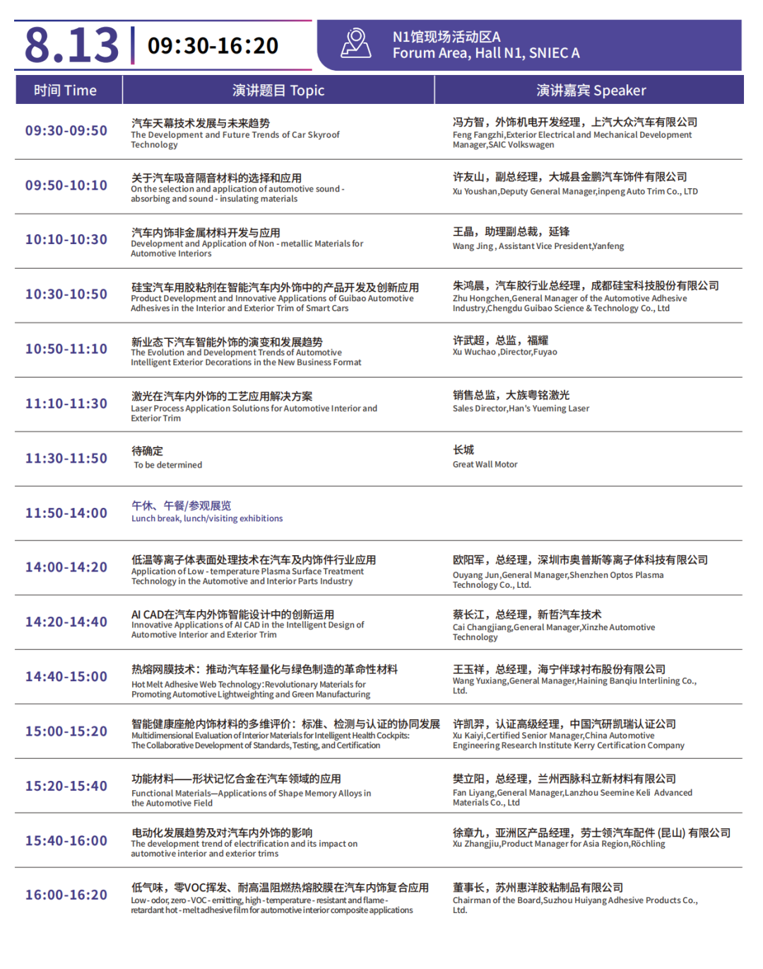 展品范围从内外饰总成、座椅、智能座 舱、车载显示、智能表面、数字格栅、汽车塑料件、装饰件、方向盘、门板、顶棚、车身覆盖件、车身结构件、外观件、智能汽车电子、被动安全、保险杠、后视镜、车灯与车辆照明以及应用领域新材料、新技术、新设备、新工艺等行业提供一站式展示汽车内外饰设计与整体解决方案。依托中国汽车产业的快速发展,展会规模与品质不断升级,已成长为全球汽车内外饰行业重要的专业展示交流平台,是海内外企业提升品牌价值、拓展海内外市场、促进技术交流、发掘行业 趋势与商机的优选平台。