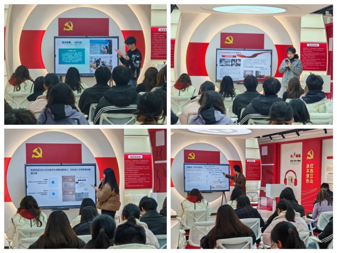 会上,四家学生组织的负责人依次上台,结合精心准备的PPT,围绕2025年度组织运行情况、特色亮点、存在不足与改进思路,以及2026年工作规划进行了系统汇报。各组织的发言既回顾了过去一年在品牌活动打造、服务同学等方面的成效,也直面工作中遇到的困难与短板,提出了下一步创新发展的具体举措。汇报内容重点突出、各具特色,不仅展示了各组织一年来的扎实工作,也为相互学习、借鉴经验提供了良好契机。现场气氛严肃而活跃,充分体现了学生骨干积极向上的精神风貌和求真务实的工作态度。