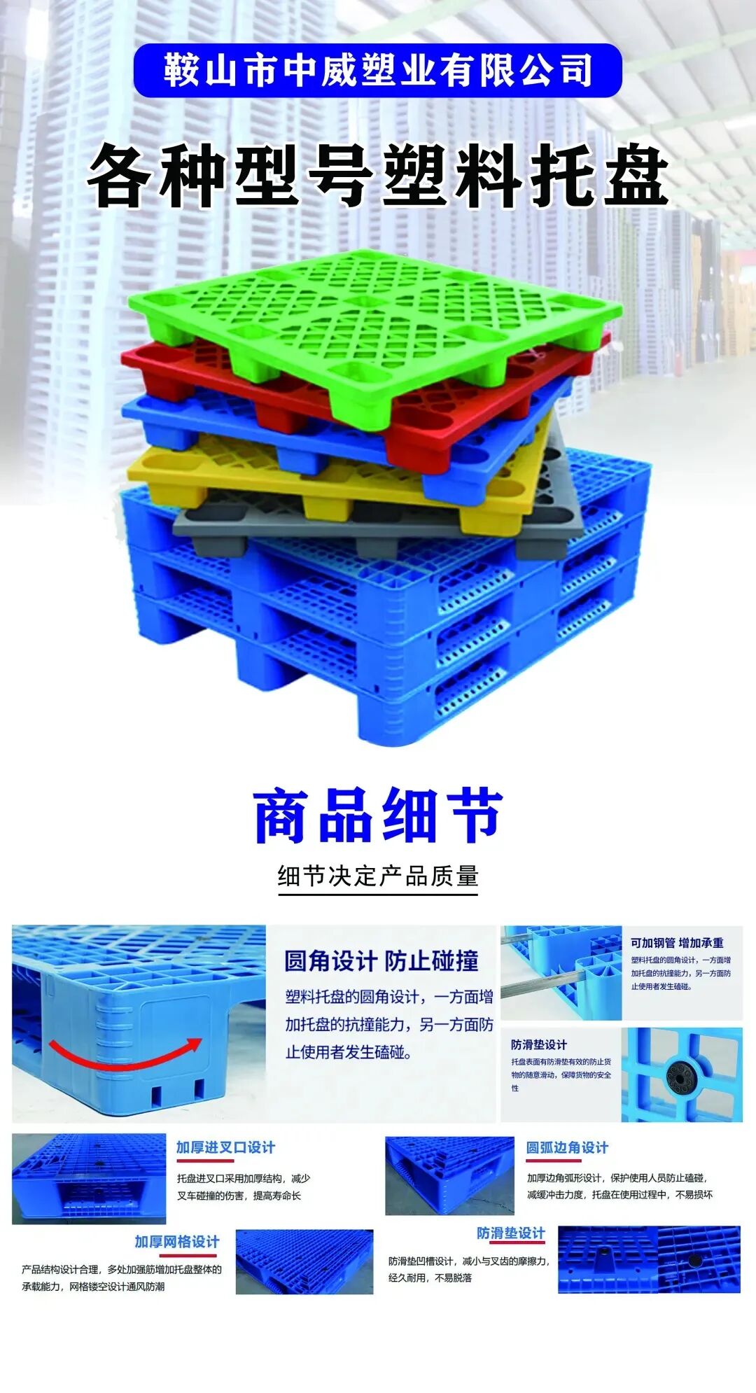 中威塑业始创于2012年,是东北地区规模最大的集生产、研发、销售、仓储、物流为一体的专业注塑企业。总部坐落于鞍山市台安县工业园区,占地面积40000平方米,现拥有生产基地1个、销售中心4个、注塑机21台、吹塑生产线2台,焊接生产线2条、各类模具200余套,日生产能力超过70吨;公司注册资本4000万元,固定资产6500万元,现有员工105人,核心骨干50余人,主要生产塑料托盘、塑料垃圾桶、塑料周转箱、塑料线盘、汽车电瓶塑料配件等塑料产品,使用场景覆盖食品饮料、医药电子、石油化工、汽车配件、仓储物流等十余个行业,年销售额近亿元。作为最具研发能力的大型注塑企业,中威塑业始终以先进的视野,行走在行业发展的前端,以创新为核心,强化产品核心竞争优势,投入大量科研费用,设立产品研发实验室,组建研发团队10余人,引进全套先进的塑料检测试验设备,严格按照ISO9001质量管理体系,ISO14000环境管理体系,ISO45001职业健康安全管理体系认证,三认证体系把控质量,确保产品合格出厂。作为辽宁省“AAA级信用企业”和“守合同重信用企业”,中威塑业与国内多行业数家龙头企业建立了长期、稳定的合作关系。在食品饮料行业长期合作客户有华润雪花集团、百威集团、农夫山泉集团、龙山泉啤酒、梅花集团等;在粮食仓储行业有中粮集团、五常米业等;在化工行业有辽宁宝来化工、辽阳石油化工等;在医药行业有东北制药集团、天士力药业、国药控股等;在玻璃制品行业有恒利玻璃、德惠才府等;在物流运输业有京东物流集团、韵达快递、美团优选、达丰物流等;在工业塑件方面有比利时贝卡尔特公司、东北蓄电池公司、一汽大连等等;秉承“求精务实,质量生存、信誉发展”的宗旨,中威塑业为客户提供定制化、个性化、差异化的产品开发及智慧化生产加工服务,每一处细节的打磨,每一道工序的磨砺,都印证了中威与时俱进的潜行动力。面对现代世界的环境危机,以及我们国家“碳达峰”、“碳综合”的战略要求,当代的塑料制品行业已经逐渐脱离原有传统行业的运行模式,开始进入技术驱动、以质量取胜、产品升级阶段,如何给市场投放绿色、环保的产品已经成为企业发展的方向和出路,正是在这个大前提下,中威塑业不断改进工艺,不断增加自动化的水平,密切与高校合作,遵循环保节能、经济适用、安全高效的原则,在塑料制品领域不懈努力和实践,以最专业的品质保证、最真诚的敬业态度给广大合作伙伴带来更佳的体验!