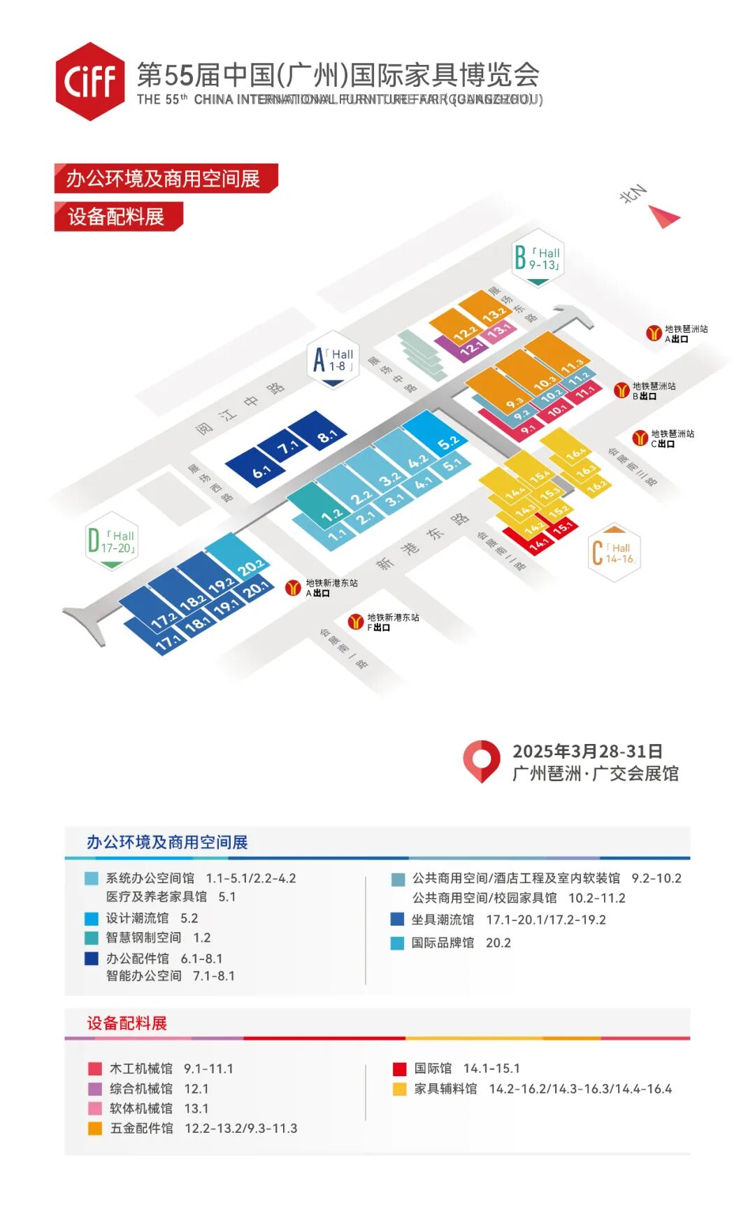 2025CIFF中国(广州)国际家具博览会分两个展区举办,2025年3月18-21日在广交会展馆举办民用家具展,2025年3月28-31日在保利世贸博览馆举办办公商用展&设备配料展。中国家博会(广州)以“设计引领、内外循环、全链协同”为定位,盛大展出民用家具、饰品家纺、户外家居、办公商用及酒店家具、家具生产设备及配件辅料等全题材产品,是以全题材、全产业链为鲜明特色的全球性大家居博览会,每届汇聚超4700家海内外顶尖品牌企业,接待200多个国家和地区的38万名专业观众。中国家博会(广州)始终致力于促进家居行业传统消费升级、服务构建新发展格局,不断提升展览品质、推动高质量发展,不断为行业、产业、企业带来更多更好的价值。