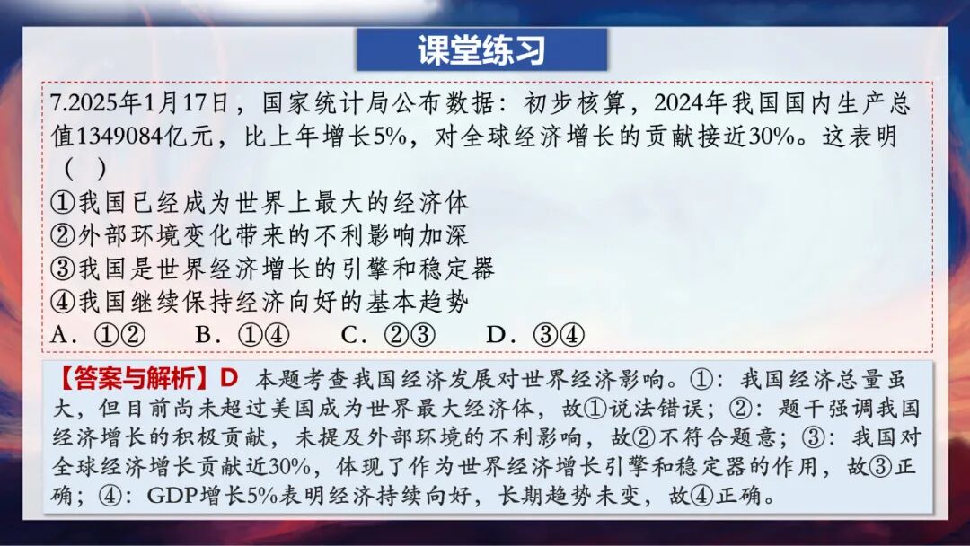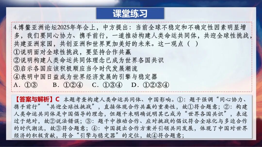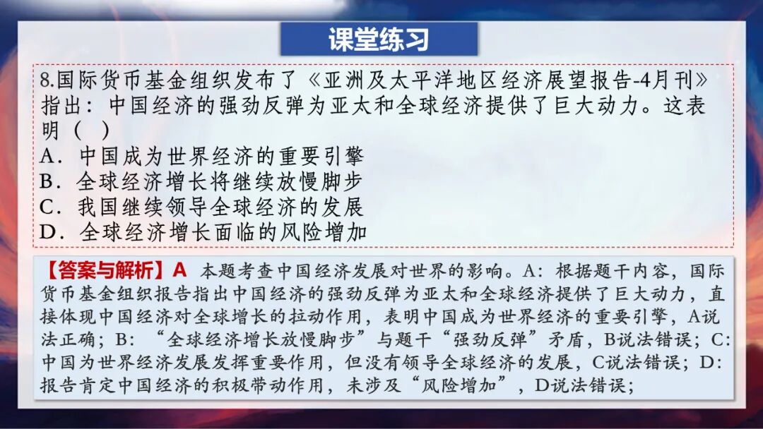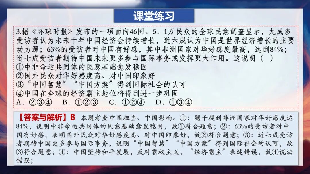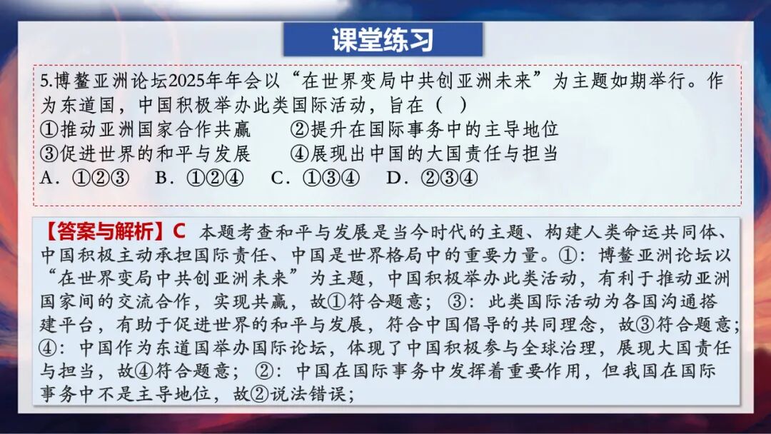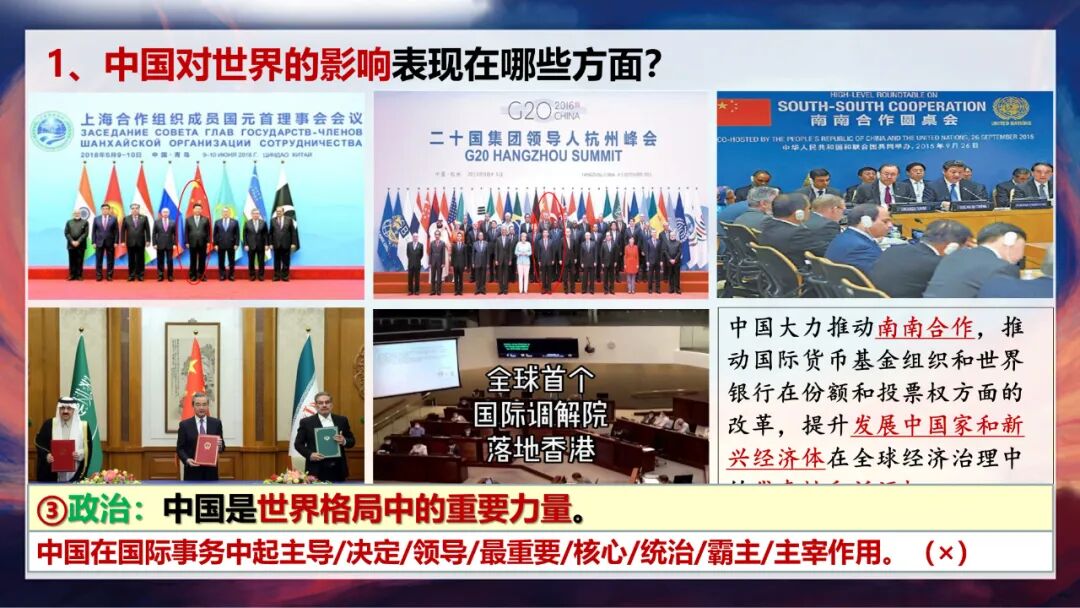 这里老师要特别强调一个易错点:大家一定要记住,中国是世界格局中的重要力量,但我们在国际事务中并不起主导、决定或统治作用,那种说法是错误的。因为,中国始终坚持和平发展,倡导国际关系民主化,坚持国家不分大小、强弱、贫富一律平等。