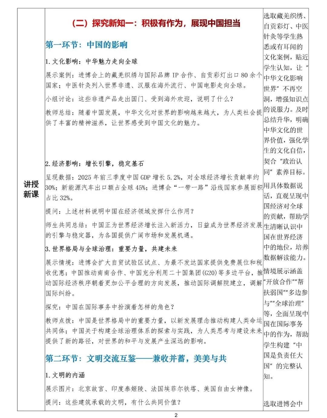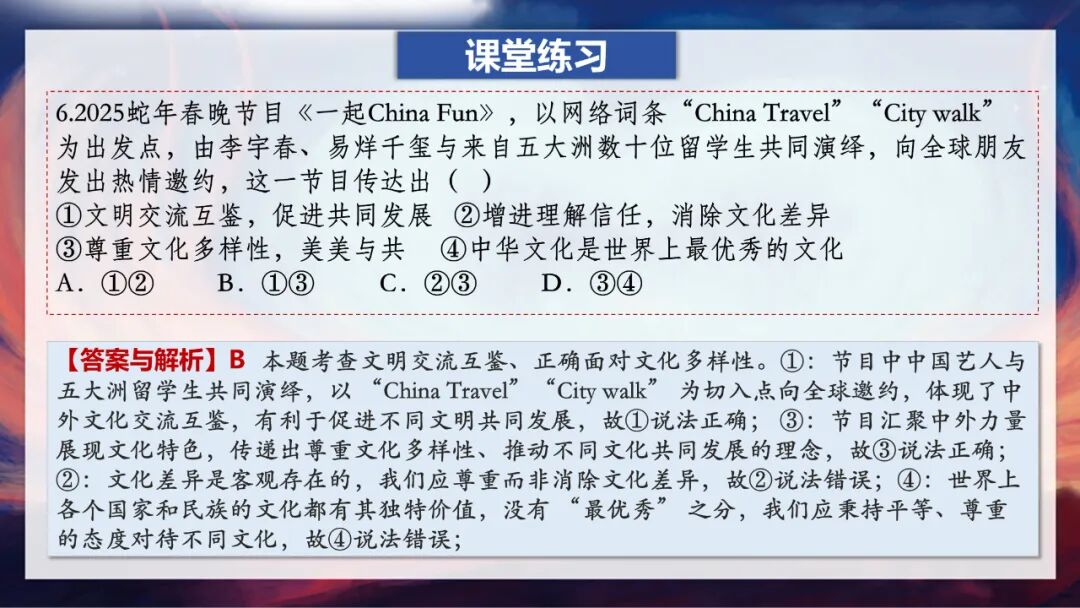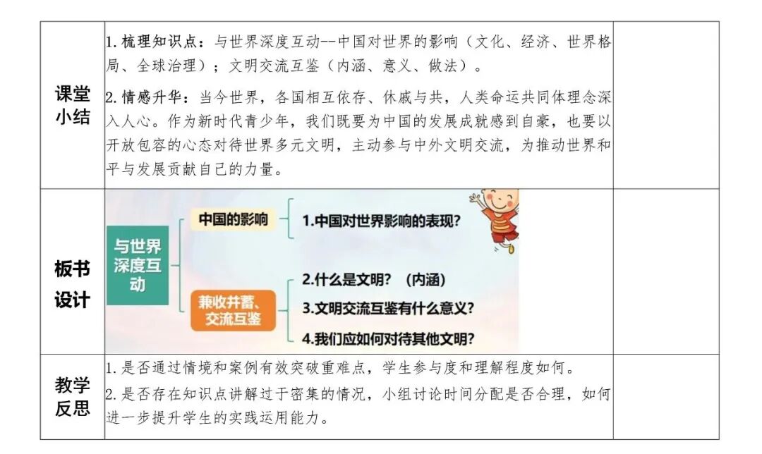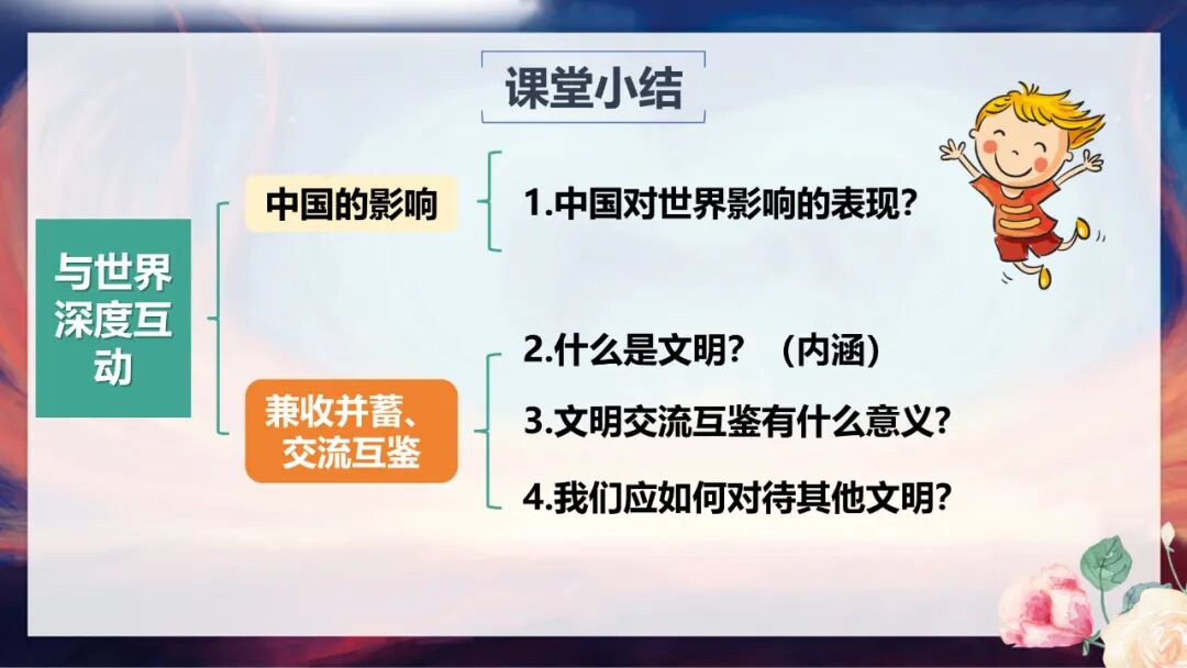 今天这节课,我们围绕“与世界深度互动”展开了学习。首先了解了中国对世界的影响体现在文化、经济、政治和全球治理四个方面:文化上,影响越来越大;经济上,成为全球增长引擎;政治上,推动构建人类命运共同体;全球治理中,贡献中国智慧与方案。然后我们探讨了文明的内涵、文明交流互鉴的意义,以及如何实现文明的兼收并蓄、交流互鉴。希望大家能明白,中国与世界的深度互动,既是中国走向世界的过程,也是世界拥抱中国的过程,而文明的交流互鉴,正是这种互动中最动人的篇章。