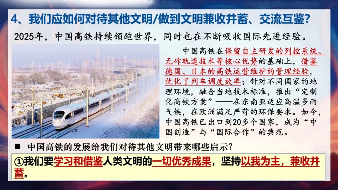 那么我们应该如何对待其他文明,做到兼收并蓄、交流互鉴呢?中国高铁的发展历程给了我们很好的启示。中国高铁在保留自主研发的列控系统、无砟轨道技术等优势的基础上,借鉴了德国、日本的高铁运营维护管理经验,优化了列车调度效率;同时针对不同国家的地理环境,融合当地技术标准,推出“定制化高铁方案”,如今已出口到20多个国家,成为“中国创造”与“国际合作”的典范。