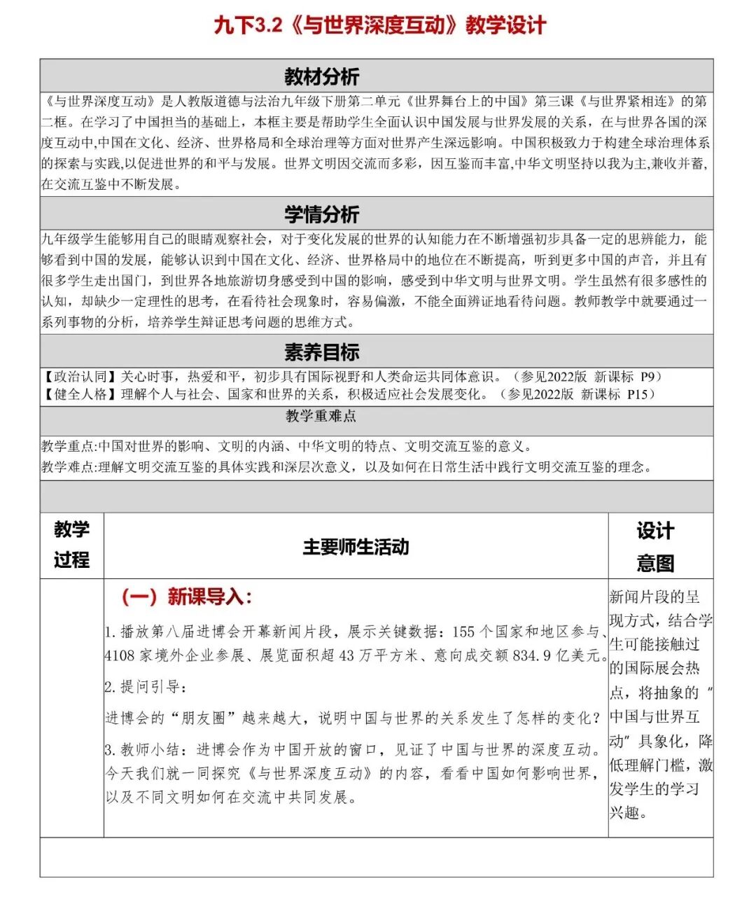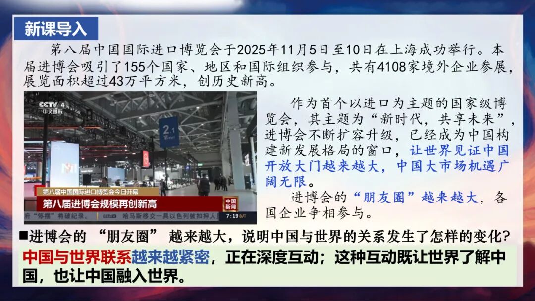 作为首个以进口为主题的国家级博览会,进博会的主题是“新时代,共享未来”。从第一届到第八届,它的“朋友圈”越来越大,各国企业争相参与。大家不妨思考一下:进博会的“朋友圈”持续扩大,这说明中国与世界的关系发生了怎样的变化?(稍作停顿,引导学生思考)非常好,我们看到中国和世界联系越来越紧密了,没错!这正是我们今天要学习的——中国正与世界深度互动,这种互动既让世界更好地了解中国,也让中国更深入地融入世界。