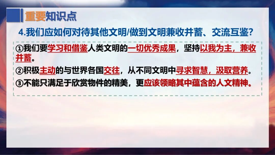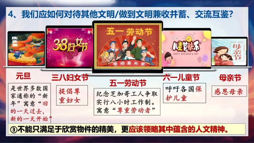 第三个要点是,对其他文明的学习,不能只满足于欣赏物件的精美,更应该领略其中蕴含的人文精神。比如我们了解元旦、五一劳动节、母亲节等节日,不仅要知道它们的庆祝形式,更要理解背后“辞旧迎新”“尊重劳动者”“感恩母亲”的人文内涵;我们接触其他国家的文化产品,也应该深入体会其传递的价值理念和精神追求。