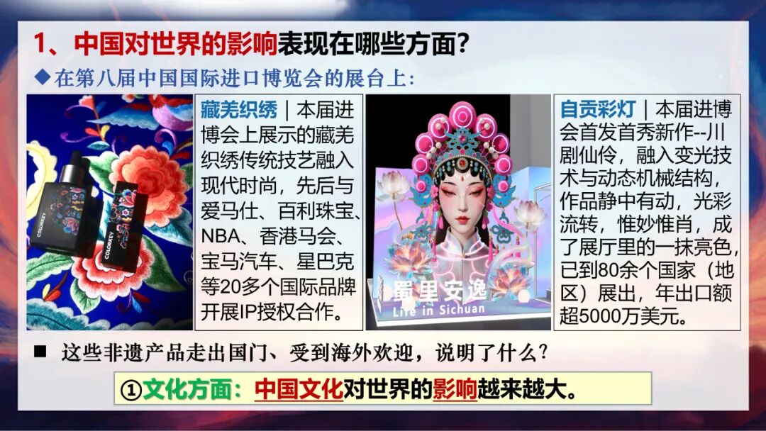 在第八届进博会上,有很多精彩的中国文化展示让人眼前一亮。比如藏羌织绣这种传统非遗技艺,不仅融入了现代时尚元素,还先后与爱马仕、NBA、宝马汽车等20多个国际品牌开展了IP授权合作;还有自贡彩灯首发的新作《川剧仙伶》,融入了变光技术和动态机械结构,静中有动、光彩流转,已经走进了80多个国家和地区,年出口额超过5000万美元。