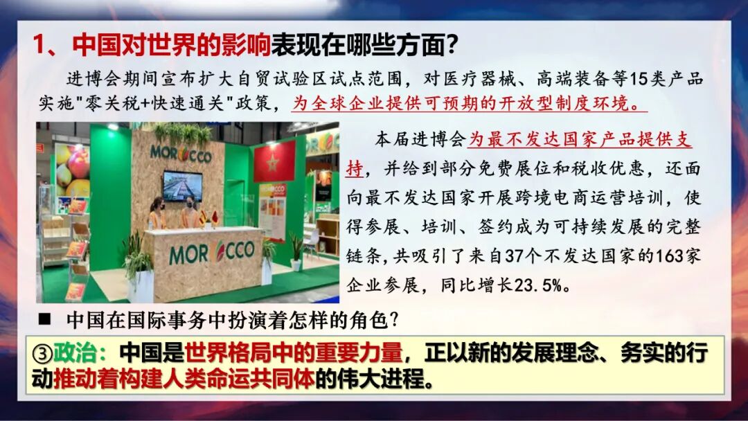 在国际事务和全球治理中,中国也扮演着越来越重要的角色。本届进博会上,中国宣布扩大自贸试验区试点范围,对医疗器械、高端装备等15类产品实施“零关税+快速通关”政策,为全球企业提供了开放型制度环境。同时,我们还为最不发达国家提供免费展位、税收优惠和跨境电商运营培训,吸引了37个不发达国家的163家企业参展,同比增长23.5%。
