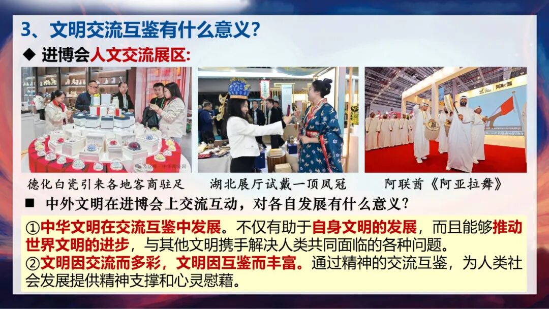 首先,中华文明在交流互鉴中发展。通过与其他文明的交流,我们不仅能汲取养分,助力自身文明的进步,还能和其他文明携手解决人类共同面临的各种问题。其次,文明因交流而多彩,因互鉴而丰富。不同文明的精神交流,能为人类社会发展提供强大的精神支撑和心灵慰藉。就像进博会上,中国的传统技艺与国外的现代设计碰撞出火花,各国的文化成果相互展示、相互启发,让整个世界的文明画卷更加绚丽。
