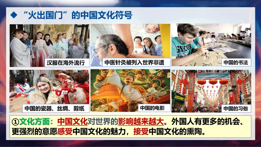 除了这些参展的非遗产品,还有很多“火出国门”的中国文化符号。中医针灸被列入世界非遗,书法、汉服在海外备受追捧,瓷器、丝绸、剪纸成为外国朋友眼中的“中国名片”,中国电影和传统习俗也让越来越多的外国人感受到中华文化的独特魅力。这些都充分说明,随着中国的发展,中国文化对世界的影响越来越大,外国人有了更多机会、更强烈的意愿去感受中国文化的魅力,接受中国文化的熏陶。