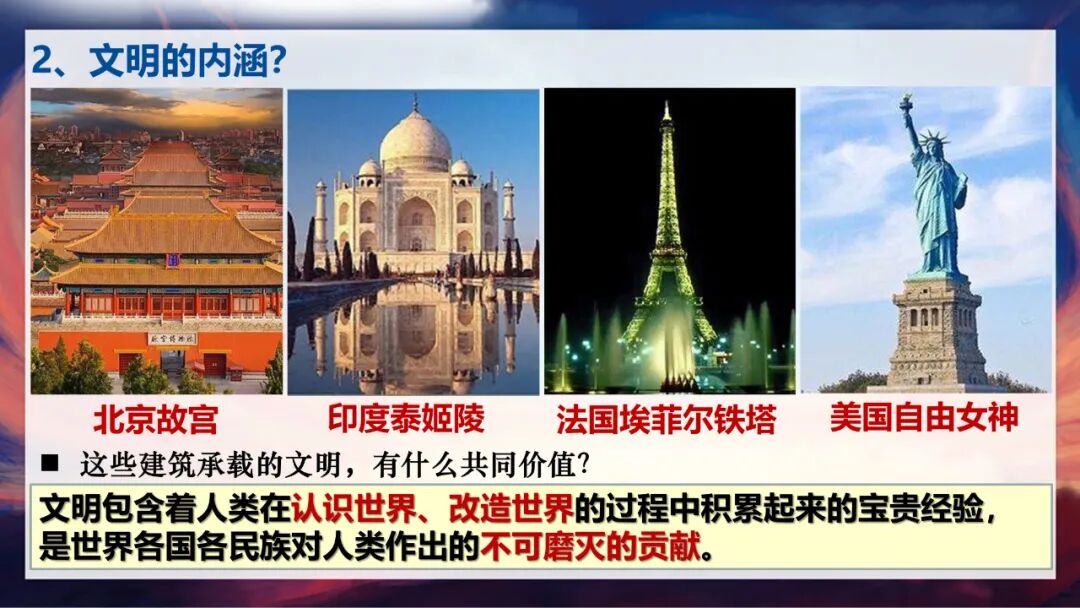 刚才我们看到了中国文化对世界的影响,其实世界上每个国家和民族都有自己的文明成果。比如中国的故宫、印度的泰姬陵、法国的埃菲尔铁塔、美国的自由女神像,这些建筑背后都承载着独特的文明。那么什么是文明呢?文明包含着人类在认识世界、改造世界的过程中积累起来的宝贵经验,是世界各国各民族对人类作出的不可磨灭的贡献。