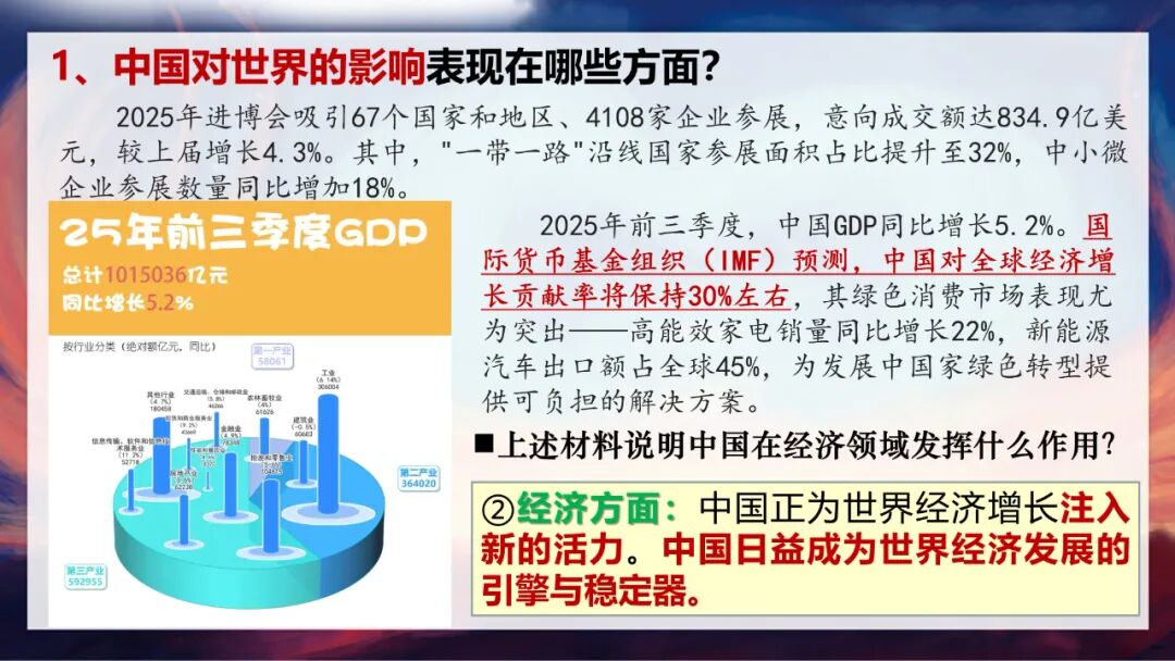 看完了文化领域,我们再来看经济方面。2025年进博会的意向成交额达到了834.9亿美元,较上届增长4.3%。其中,“一带一路”沿线国家参展面积占比提升至32%,中小微企业参展数量同比增加18%。而2025年前三季度,中国GDP同比增长5.2%,国际货币基金组织预测,中国对全球经济增长的贡献率将保持在30%左右。