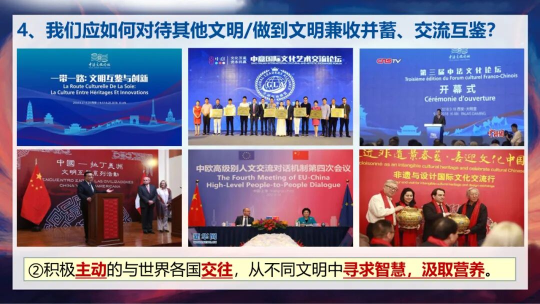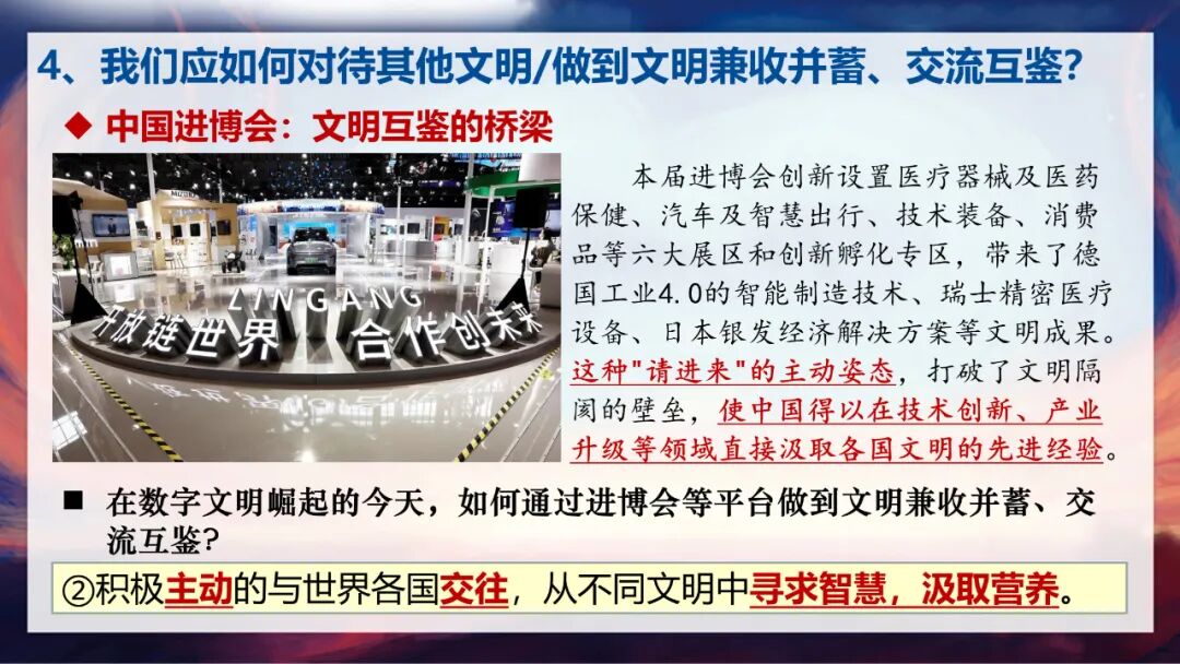 第二个要点是积极主动地与世界各国交往,从不同文明中寻求智慧,汲取营养。进博会就是这样一个重要平台,它通过“请进来”的主动姿态,打破了文明隔阂的壁垒,让我们能汲取各国文明的先进经验,比如德国的智能制造技术、瑞士的精密医疗设备、日本的银发经济解决方案等。此外,中意国际文化艺术交流论坛、中法文化论坛、中欧高级别人文交流对话机制等,都是我们与世界文明交流的重要桥梁。