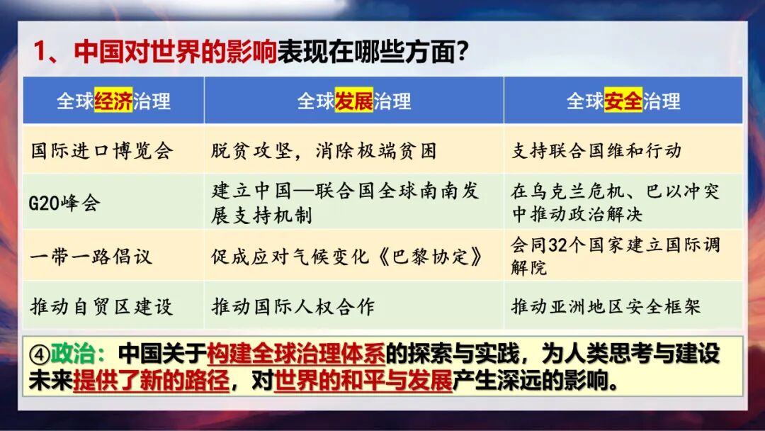 在全球治理的各个领域,都能看到中国的积极参与:在经济治理方面,我们举办进博会、推动G20峰会合作、推进“一带一路”倡议;在发展治理方面,我们积极开展脱贫攻坚实践、建立中国—联合国全球南南发展支持机制、促成《巴黎协定》;在安全治理方面,我们推动建立国际调解院、在国际冲突中推动政治解决、建立国际调解院。这表明中国是世界格局中的重要力量,正以新的发展理念、务实的行动推动构建人类命运共同体,我们关于全球治理体系的探索与实践,也为人类未来提供了新路径,对世界和平与发展产生深远影响。