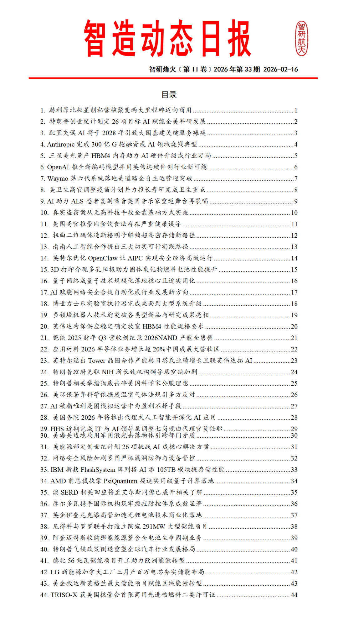 聚焦全球智能制造领域的权威情报产品,每日精选航空技术与应用人工智能、工业机器人、增材制造、芯片工艺等核心技术突破与产业动态,以结构化、可编辑的文档形式呈现。内容涵盖技术解析、企业战略及政策影响,依托资深专家团队及强大的开源情报处理能力,助力企业快速捕捉技术趋势与市场机遇,把握智造脉搏,引领产业升级。