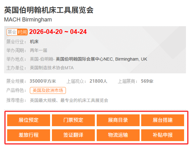 英国伯明翰机床工具展MACH Birmingham被公认为英国自动化、电力传输和专业的机床工具领域的领先展会。英国伯明翰机床工具展MACH Birmingham更是中国机床工具领域的企业进军英国最佳贸易平台。