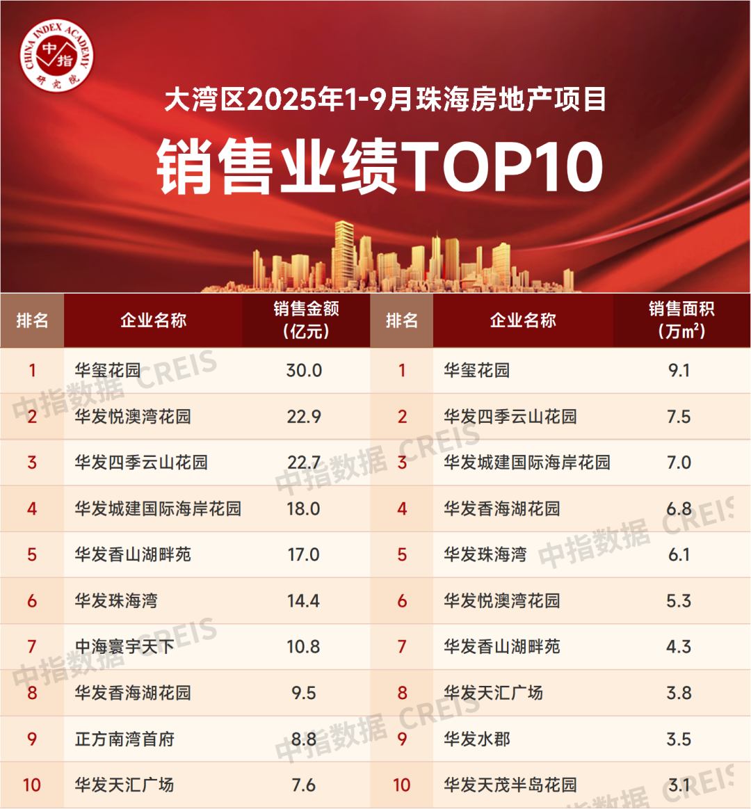 2025年1-9月珠海房地产项目销售金额前10门槛值为7.6亿元,同比去年提升1.2亿元。其中香洲区华玺花园以30.0亿元的销售额位居榜首;位于横琴新区的华发悦澳湾花园以22.9亿元的销售金额位居榜单第二;位于香洲区的华发四季云山花园以22.7亿元的销售金额位居榜单第三。