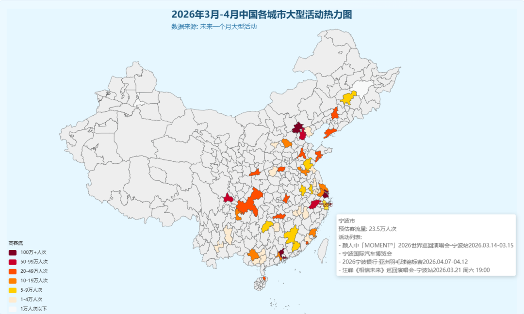 本报告涵盖2026年3月16日至4月16日期间,全国范围内举办的各类大型活动共计150余场,涵盖以下类型:展会:如北京新能源车展、深圳家具展、广交会等,观众规模普遍在5万至40万之间;体育赛事:包括中超、中甲、苏超、羽毛球锦标赛、马拉松等,场馆容量多在1万至6万;演唱会:如薛之谦、蔡依林、周杰伦、凤凰传奇等,场馆容量多在1万至9万;网红IP:如迪士尼、环球度假区、洛阳古城等,持续吸引游客;节假日:清明节、泼水节、三月三、洛阳牡丹文化节等,影响全国或区域客流。