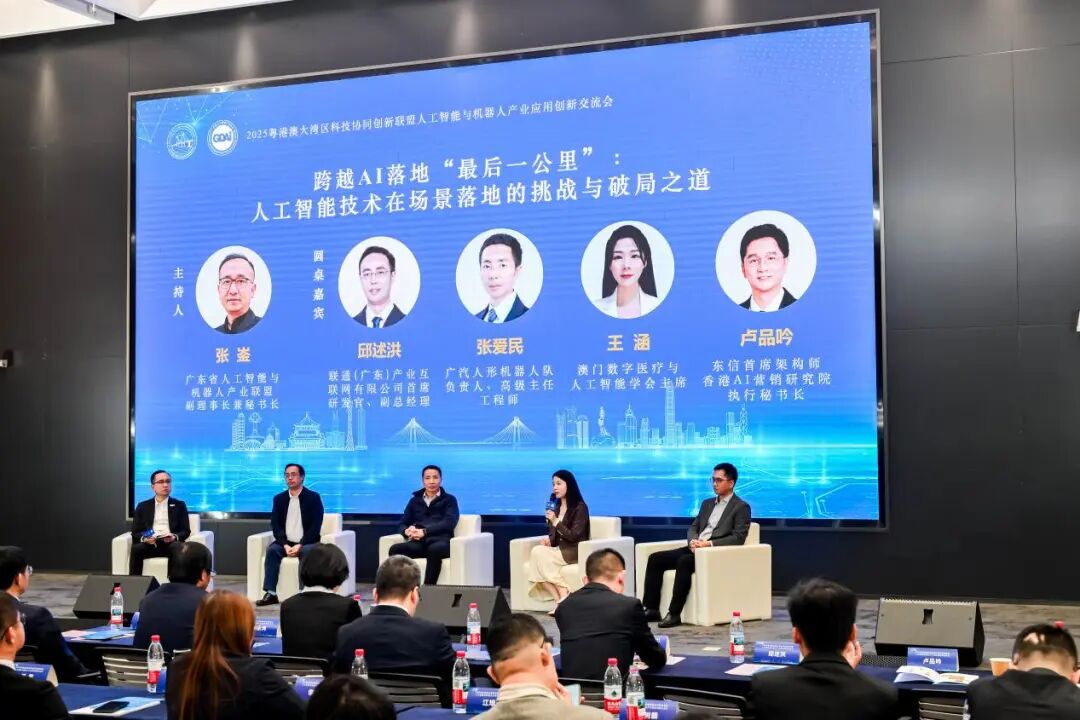 圆桌对话环节由广东省人工智能与机器人产业联盟副理事长兼秘书长张崟主持,围绕“跨越AI落地‘最后一公里’:人工智能技术在场景落地的挑战与破局之道”这一核心议题展开深入探讨。广东省人工智能产业协会副会长、联通(广东)产业互联网有限公司首席研发官、副总经理邱述洪,广汽人形机器人团队负责人、高级主任工程师张爱民,澳门数字医疗与人工智能学会主席王涵,东信首席架构师、香港 AI 营销研究院执行秘书长卢品吟等嘉宾基于行业视角,从技术研发、场景应用、资源整合等多个维度分享见解,为破解 AI 落地难题提供了多元思路。