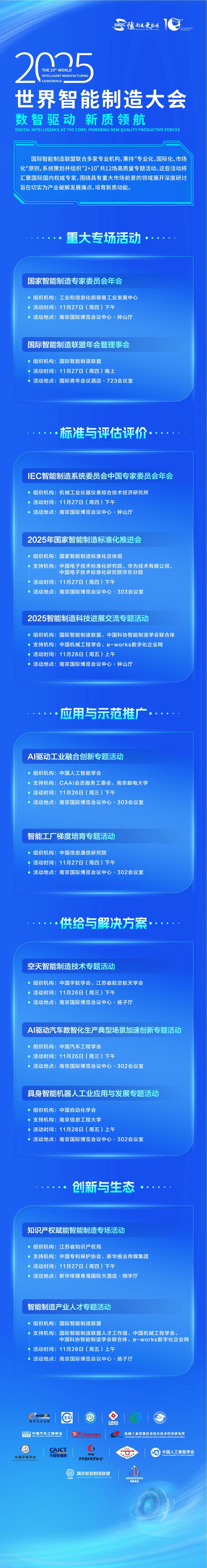 由江苏省人民政府、国际智能制造联盟共同主办,江苏省产业技术研究院等单位联合承办的2025世界智能制造大会定于11月27日—29日在南京市举办。本届大会将举办1场主题大会、12场专题活动以及若干场产业生态系列活动,着力打造集高端论坛、成果发布、前沿展示、产业对接等形式于一体的智能制造国际盛会。专题活动面向社会公众开放专业观众席位,诚邀国内外智能制造领域的专家学者、科研院所代表、企业相关部门代表、行业机构代表、产业园区代表、媒体记者等莅临现场参会。大会专题活动邀请围绕四大板块——标准与评估评价、应用与示范推广、供给与解决方案、创新与生态构建展开深度研讨,议题覆盖智能制造科技进展、智能制造标准、AI驱动工业融合创新、空天领域智能制造应用、知识产权赋能等热点方向,聚焦前沿趋势、关键技术及产业实践。此外,大会还将举办国家智能制造专家委员会年会、国际智能制造联盟年度大会暨理事会等重大专场活动。专题活动日程(持续更新)及注册通道板块一:标准与评估评价2025智造科技进展交流专题活动https://icim.glueup.cn/event/48720/2025年国家智能制造标准化推进会https://icim.glueup.cn/event/48717/板块二:应用与示范推广AI驱动工业融合创新专题活动https://icim.glueup.cn/event/48712/智能工厂梯度培育专题活动https://icim.glueup.cn/event/48716/板块三:供给与解决方案空天智能制造技术专题活动https://icim.glueup.cn/event/48690/AI驱动汽车数智化生产典型场景加速创新专题活动https://icim.glueup.cn/event/48711/板块四:创新与生态具身智能机器人技术与发展专题活动https://icim.glueup.cn/event/48722/知识产权专场活动https://icim.glueup.cn/event/48718/智能制造产业人才专题活动https://icim.glueup.cn/event/48721/⊙ 建议在电脑端浏览上述网页并注册⊙ 活动总览页面:https://icim.glueup.cn/org/icim/或点击文末“阅读原文”一键跳转⊙ 活动报名截止时间:2025年11月20日 17:00点在同期举办的智能制造专业展览上,长三角国家技术创新中心将携多件展品,展出创新体系内智能制造相关成果和典型案例。江苏省产业技术研究院/长三角国家技术创新中心展位位于【5号展馆 5A01】,欢迎各界专家和合作伙伴莅临展台。2025世界智能制造大会官方网站:http://www.wimc.org.cn。“数智驱动,新质领航”,让我们共同期待这场盛会,共同见证智能制造新时代的到来!活动整体咨询:何老师:15161696406宋老师:18851708540相关阅读智造十年,引领未来 | 2025年世界智能制造大会即将启幕