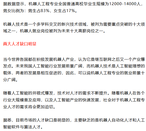 机器人工程专业的学生具有厚基础、宽口径、重实践、富创新的特点,还有融合掌握多学科基础理论的优势。从事机器人相关领域工程技术人员平均收入一般要远高于同期毕业的其他专业学生。在国内机器人工程毕业生从事的职业也属于中高收入,当然这和学生就业岗位也有一定的关系,具体因机电类、电子信息软件类、算法类有所差别。