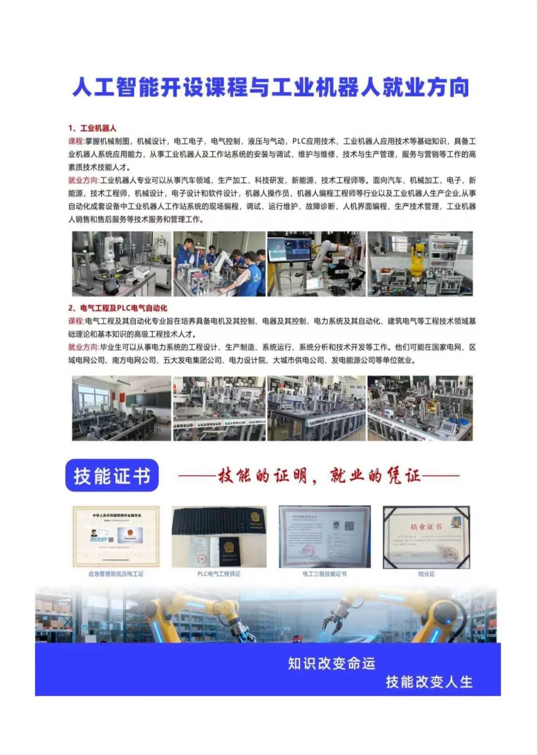 学员可录中级/高级技工或预备技师学籍,获取毕业证书及“工业机器人应用技术工程师证”“PLC电气工程师证”“电工证”等职业资格证。