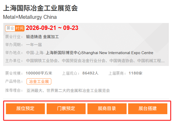 中国上海国际冶金工业展Metal + Metallurgy China是“中国国际铸造博览会”、“中国国际冶金工业博览会”、“中国国际工业炉展览”以及“中国国际耐火材料和工业陶瓷展览会”一个屋檐下。