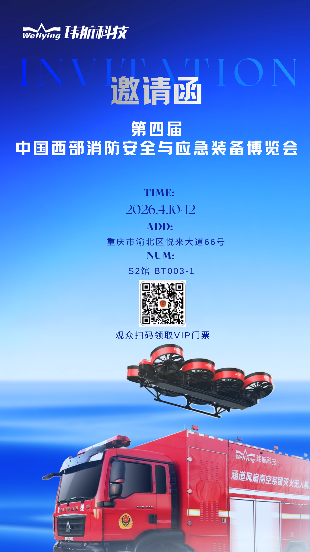 由重庆消防协会主办,北京汉森国际展览有限公司、成都市公羊会公益服务中心联合主办的第四届中国西部消防安全与应急装备博览会将于2026年4月10-12日在重庆国际博览中心举行,玮航科技携涵道风扇高空系留主战灭火无人机系统——敖钦参展,诚邀您拨冗莅临,共话行业发展!