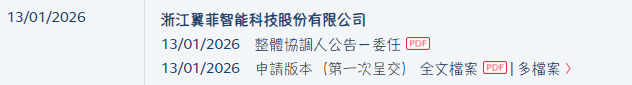据港交所网站披露,浙江翼菲智能科技股份有限公司(简称:翼菲智能)在2025年6月30日向港交所递交的港股招股书满6个月,于12月30日失效后,于2026年1月13日,再次递表港交所拟于主板上市。