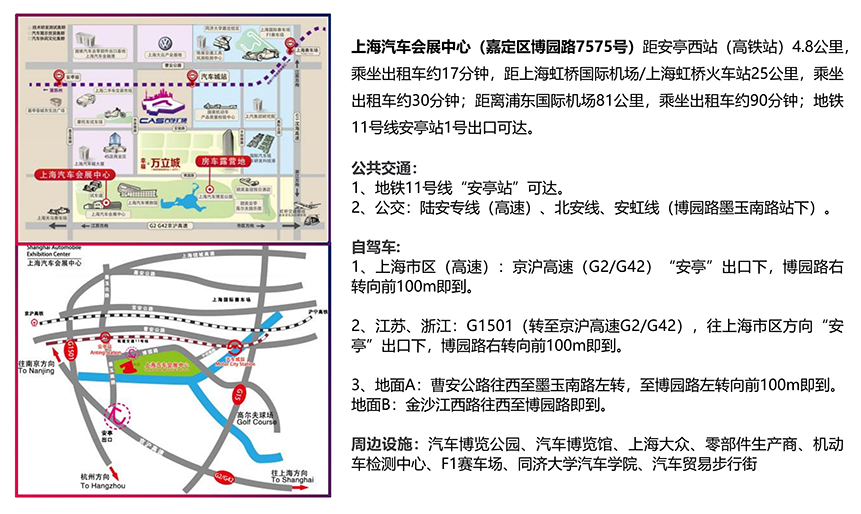 3)上海火车站:地铁3号线或4号线至“曹杨路”站转11号线(安亭方向)至“安亭”站,2号口出,距离1.6公里,步行约23分钟。