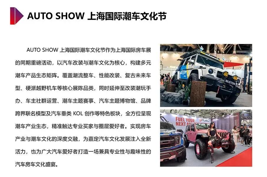 潮车文化子展:设立“AUTO SHOW上海国际潮车文化节”,聚焦改装车、潮玩及圈层文化。